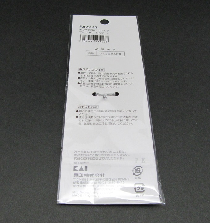 貝印アイスクリームスプーンの裏面は以下のようになっています。